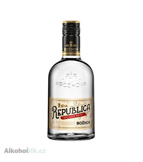 Božkov Republica Exclusive White - kvalitní 38% blend karibských rumů, který pochází z pečlivě vybraných destilérií Dominikánské republiky, Trinidadu, Guyany a Jamajky. Jeho průzračnou barvu doprovází jemná, nasládlá chuť, ve vůni pak rozeznáte vanilku, karamel, bílou čokoládu a kandované ovoce. Je ideální pro přípravu míchaných drinků, avšak představuje i jeden z mála bílých rumů, jenž si lze vychutnat také samotný či na ledu.